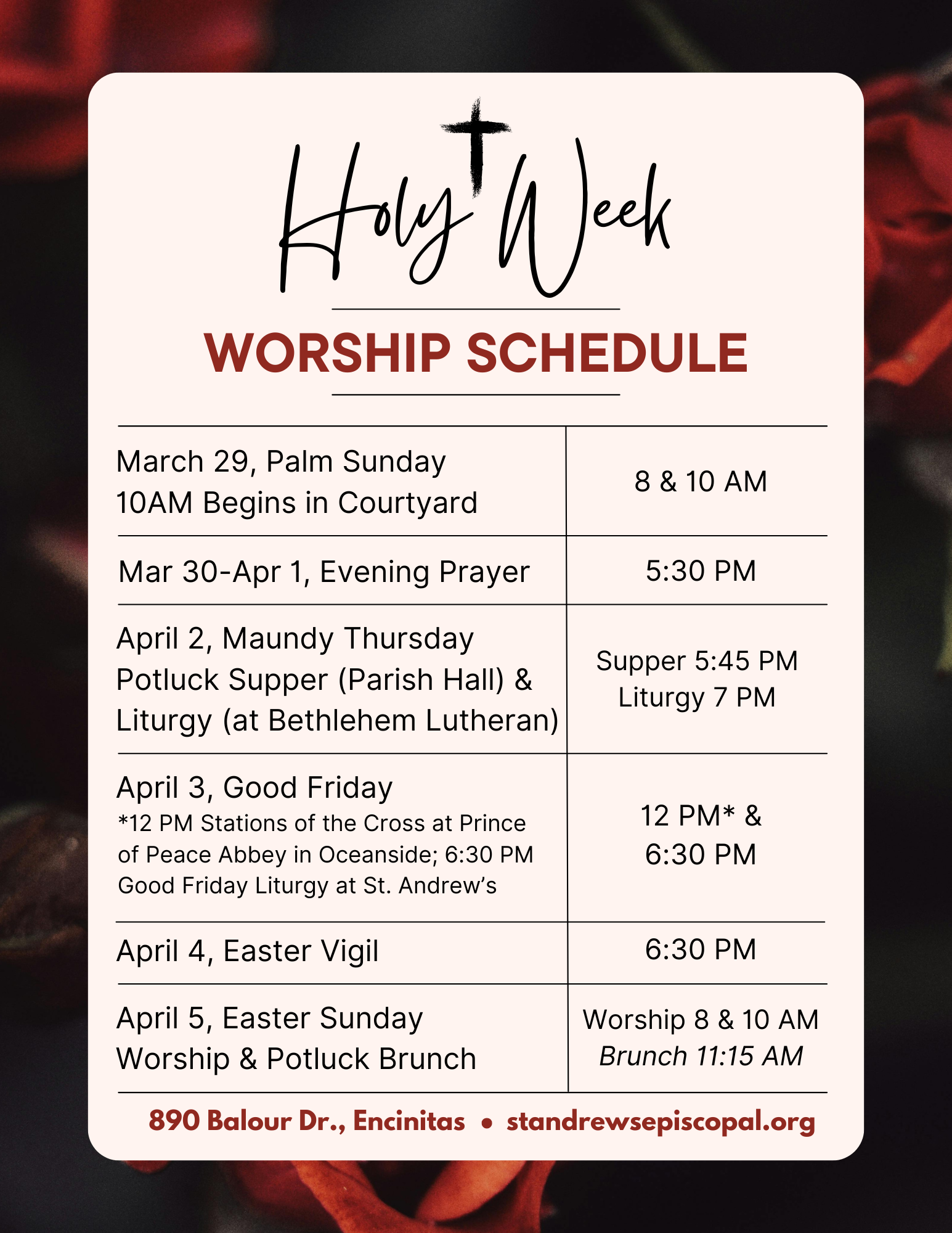 • 4/3 – Good Friday: 12 pm Stations of the Cross at Prince of Peace Abbey in Oceanside, 6:30 pm Good Friday Liturgy at St. Andrew’s